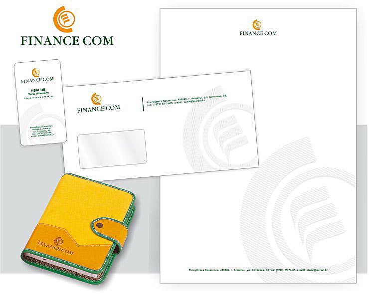 FINANCE СOM Разработка логотипа, индивидуальных визиток, официального бланка, конверта, нанесение логотипа на сувенирную продукцию.